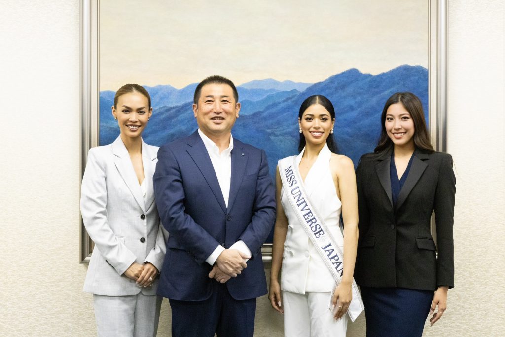 2024年日本代表のチャクラボルティー雅と、ナショナルディレクター美馬寛子、そして2023年日 本代表の宮崎莉緒の3名が、徳島県吉野川市役所を表敬訪問しました。訪問の際、チャクラボル ティー雅は、阿波踊りの体験について吉野川市長の原井敬様に報告しました。原井市長は、吉 野川市の自然の豊かさについてお話され、またミス・ユニバース・ジャパンについても非常に興味 深くお話を聞いてくださいました。